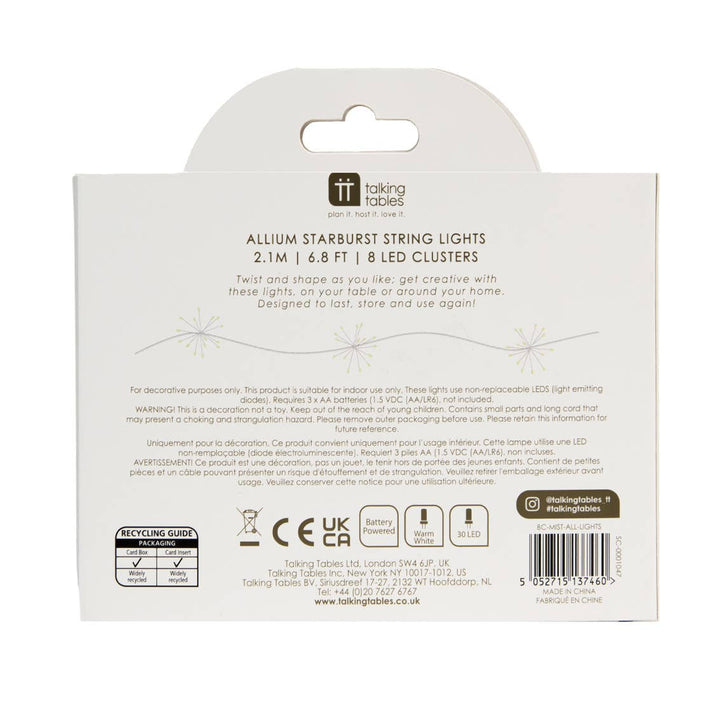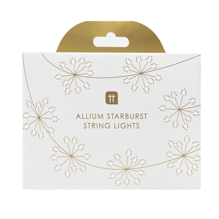Allium Starburst LED String Lights by Talking Tables. Help your store bloom just like your garden with these allium flower string lights. Open out each cluster of LED lights and twist and shape into a starburst shape. A warming winter or Christmas decoration for your customers homes, these battery powered string lights will illuminate a Christmas table with a warm glow or add a lift to your Christmas décor wrapped around a banister, bedframe or bookcase.
