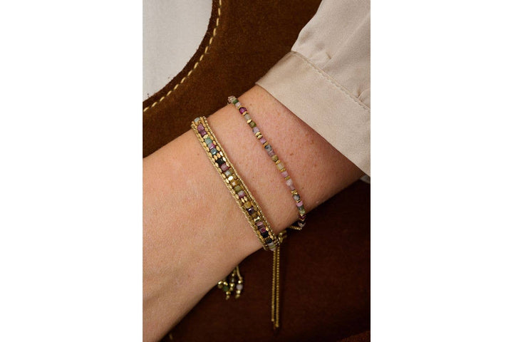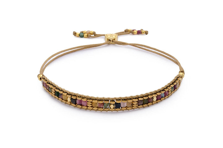 Carefully handcrafted with faceted tourmaline beads and gold-plated accents, this beaded bracelet brings together a mix of warm earthy tones, rich pinks, and soft taupes for a look that’s timeless yet full of personality.