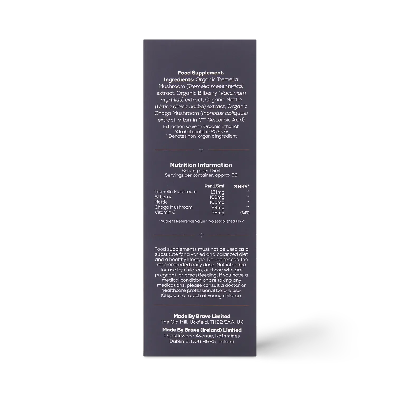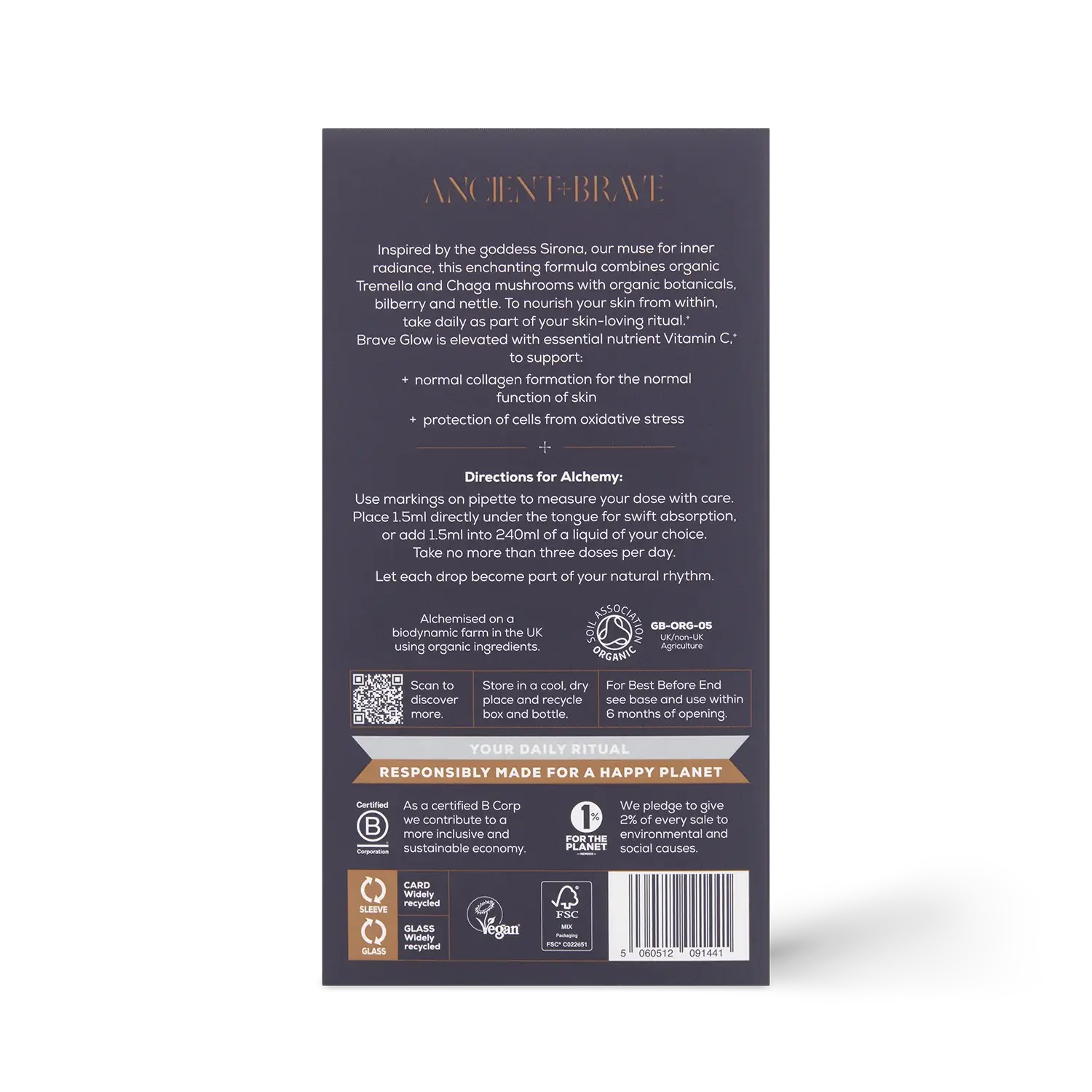 Brave Glow is a fast-absorbing tincture thoughtfully crafted with skin-friendly mushrooms Tremella and Chaga, antioxidant-rich Bilberry and Nettle, and Vitamin C to support your daily routine. This synergistic blend is designed to complement your skincare ritual, offering nourishment from the inside out.
