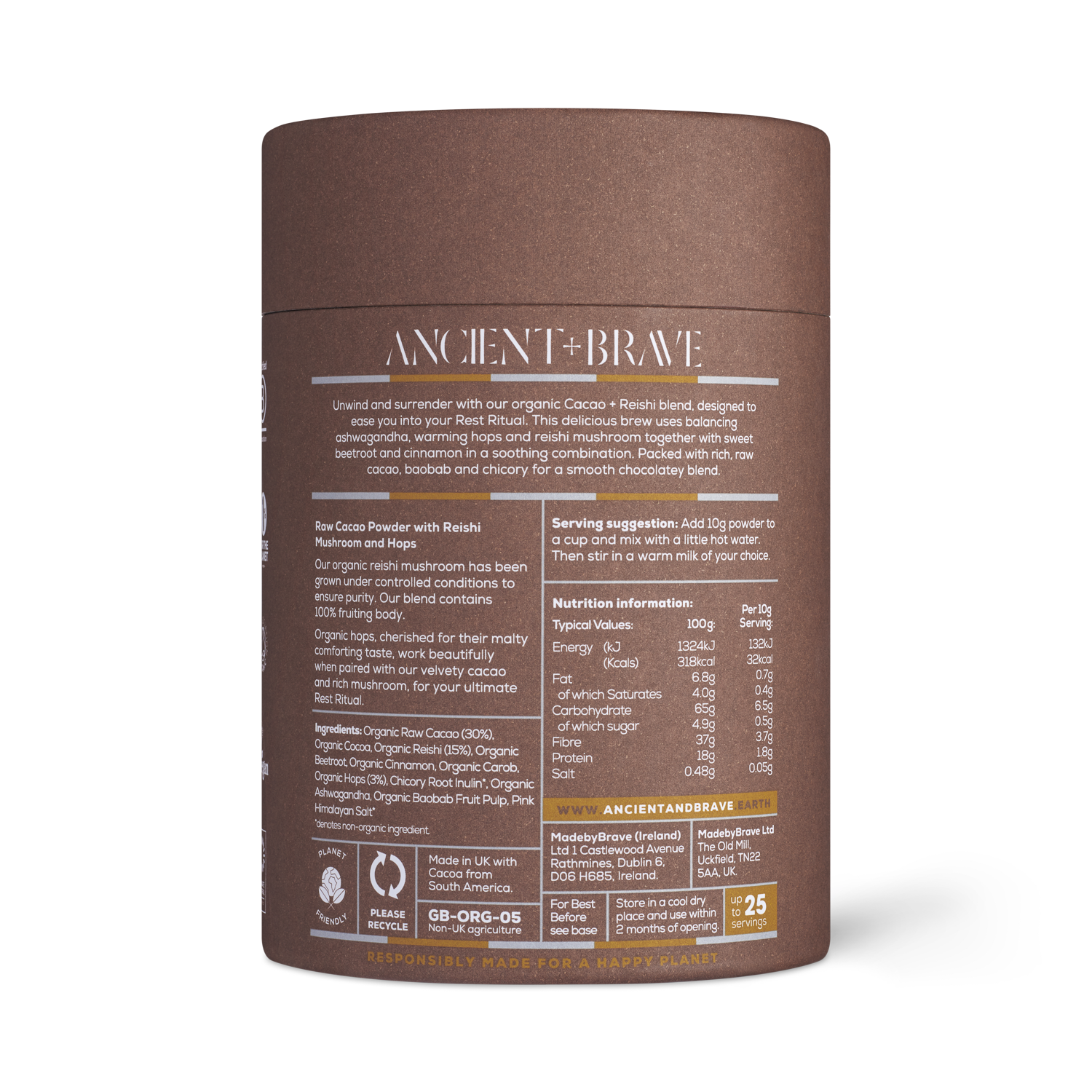 This delicious raw cacao brew with balancing ashwagandha, warming hops and reishi mushroom crafted to transport you into a state of tranquillity in your Rest Ritual.