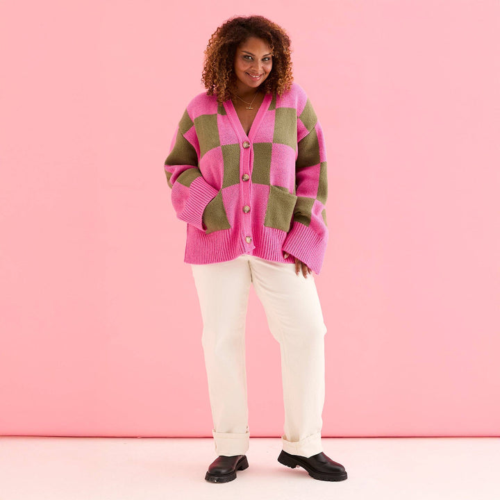 Turn heads in Candice, our bold and playful oversized cardigan reimagined in a dopamine-bright pink and khaki checkerboard knit. Designed in a chunky knit with our signature slouchy fit, she’s the ultimate throw-on knit for days when you want your outfit to do the talking. Finished with a button-through front, roomy pockets, and ribbed trims, Candice balances cosy comfort with standout style.