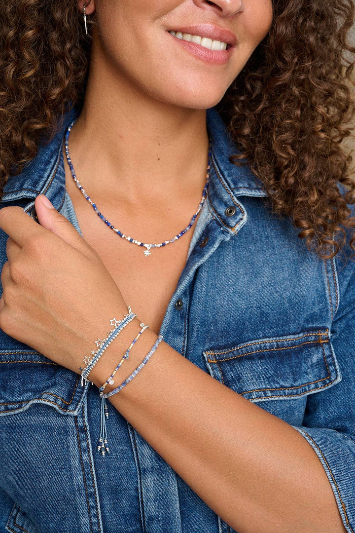 The perfect blend of laid-back energy and polished style, this silver charm bracelet is strung with glossy silver beads and scattered with dangling star charms that twinkle as you move. The soft, dusky blue cord gives it a lived-in, denim-inspired feel, a nod to road-trip freedom, while the adjustable slider makes it easy to wear, stack, and gift.