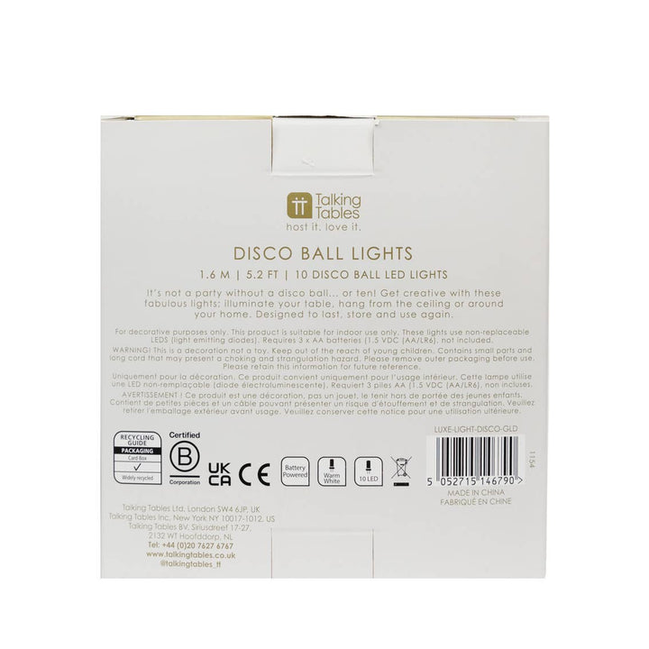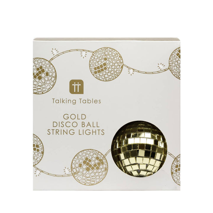 Luxe Gold Disco Ball String Lights by Talking Tables. Disco is back and bigger then ever! Help your customers bring this ’70s icon into their homes or party venues with these battery powered lights. Featuring 10 light up disco balls, weave through table decorations, wrap around a banister or put inside a large glass bowl to see the light reflect and dance around the room. Ideal for using all year round as home décor or for a Birthday, Barbie Party, Wedding, Christmas or New Years party.