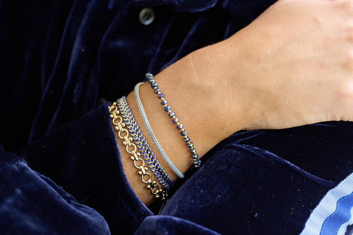 A handmade woven bracelet made of blue ombré colour tone cord with gold chevron accent beads and an adjustable easy friendship style fastening. Beautiful with day or evening wear, this bracelet pairs easily with other bracelets from our collection for a statement layered look.