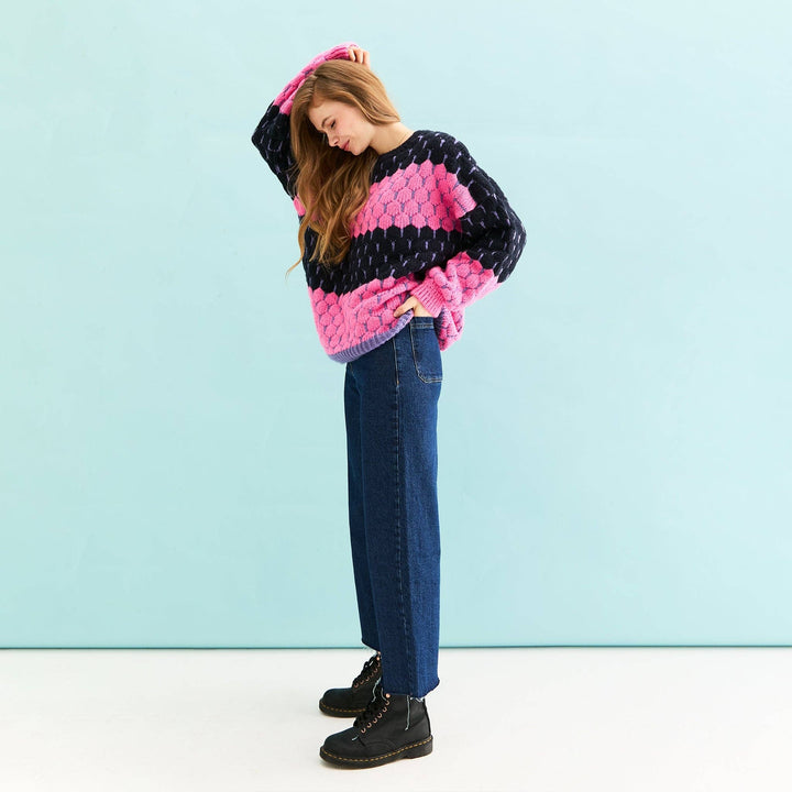 Our Marissa stripe bubble stitch jumper was so popular, we had to bring her back this season in a brand new colourway! The bubble stitch pattern boasts bunches of brightness in its thick striped pattern of vibrant pink and contrasting dark navy hexagonal bubbles.