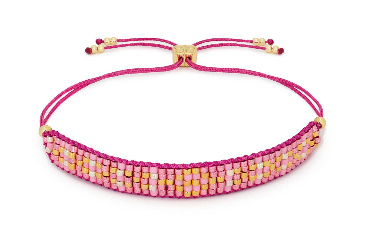 Let the bright pink threads and golden accents serve as a reminder of the beauty in boldness, where passion meets grace in perfect harmony. The beaded bracelet’s intricate design is completed with rows of round golden beads and an elegant Boho Betty slider bead, ensuring a perfect fit.