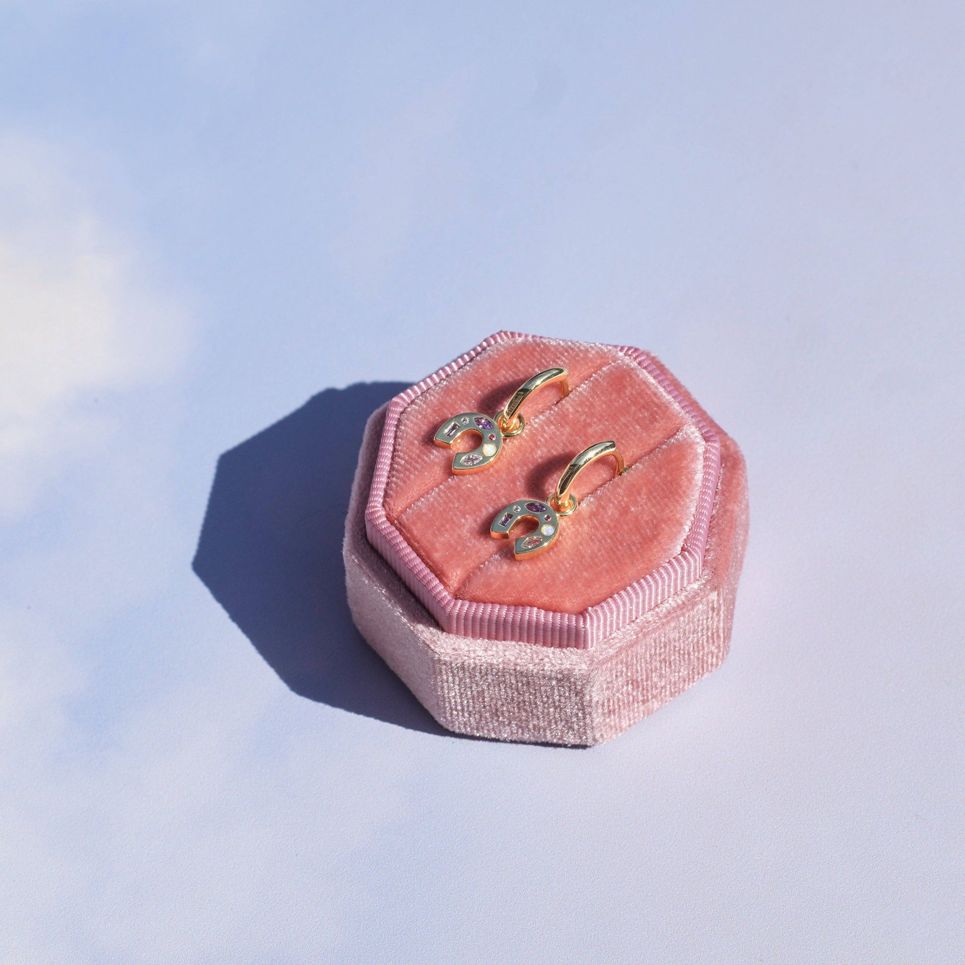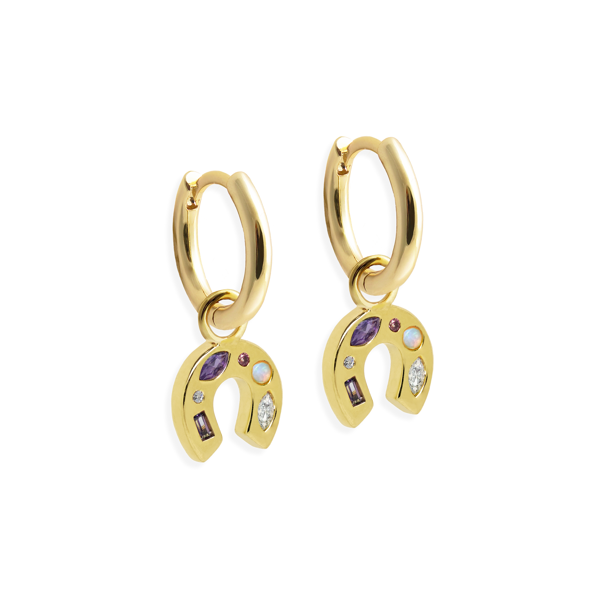 Who wouldn’t want tiny lucky charms to wear in their ears? The charm is decorated with an array of irregular gemstones that sparkle in the light. Each stone holds meaning and collectively these jewels create a dazzling talisman designed to bring the wearer luck and positivity.