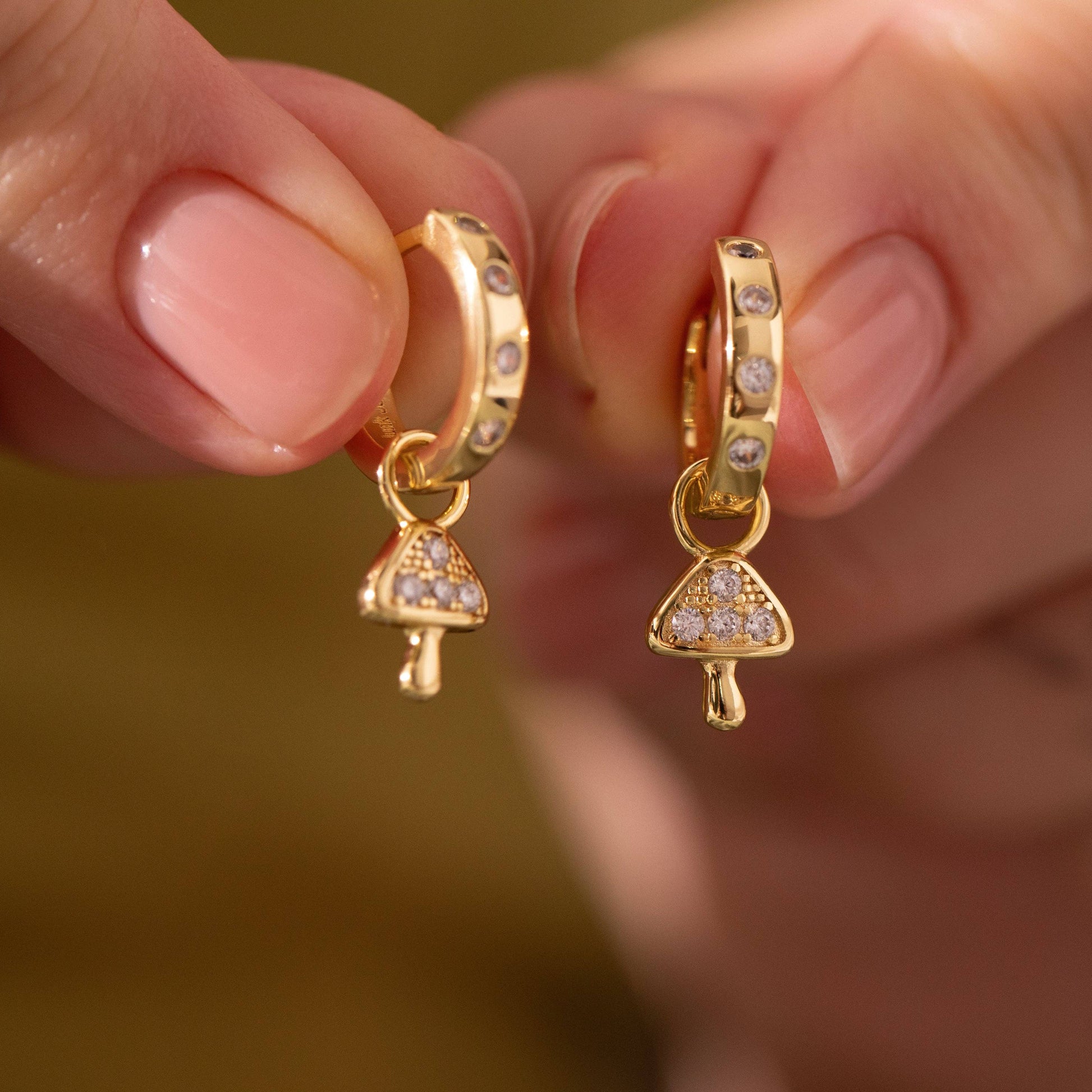 The sparkling mini mushroom charm is a sweet addition to the small but chunky hoop earring style.
