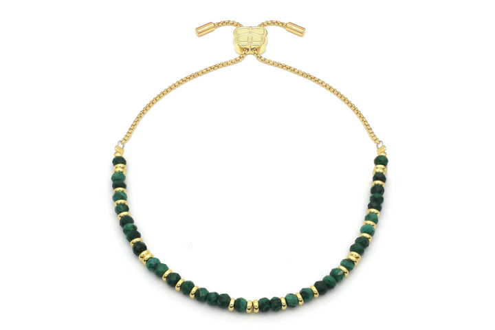 A little star from our wellness range, this gold bracelet is loaded with striking deep green malachite gemstones. Known as the ‘Stone of transformation’, malachite is thought to protect against negative energies and pollutants, to guard against radiation of all kinds, to improve immunity, and to support spiritual growth. Looks amazing on its own, but even better when layered with other bracelets from the collection.
